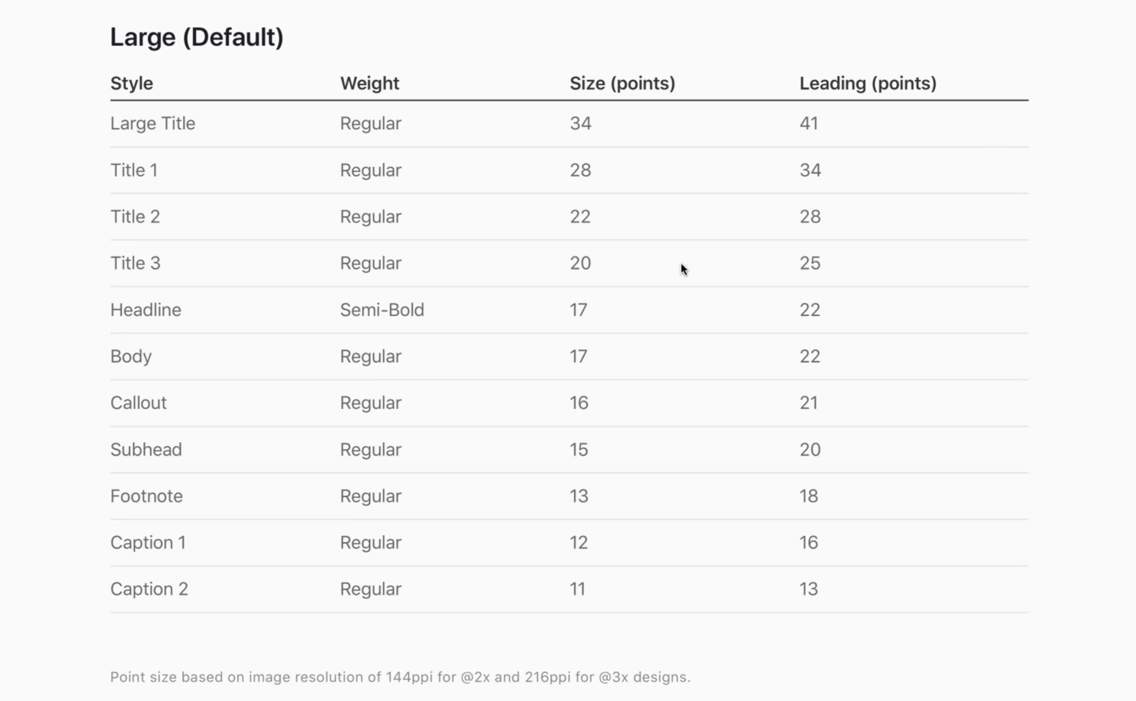 Dynamic Type은 텍스트의 Font Size를 정해 놓은 것이 아니라 스타일로 지정하는 것을 이릅니다. 스토리보드 또는 코드로 설정할 수 있습니다. 밑에 보이는 표가 각 스타일에 따른 사이즈를 표시한 Dynamic Type입니다.