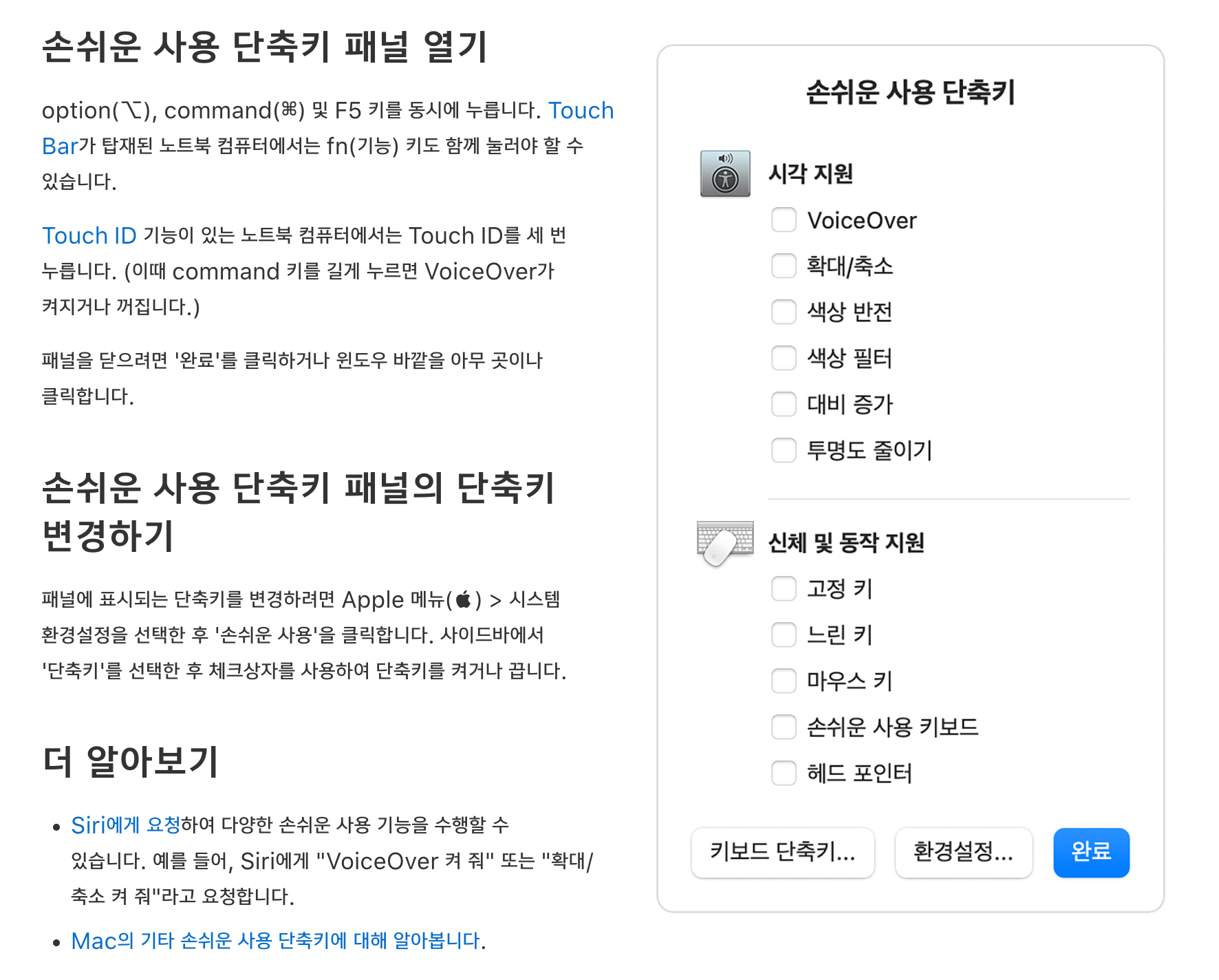 손쉬운 사용 단축키 패널에서는 확대/축소, VoiceOver, 고정 키 등의 일반적인 손쉬운 사용 기능을 빠르게 켜거나 끌 수 있는 단축키를 제공합니다.