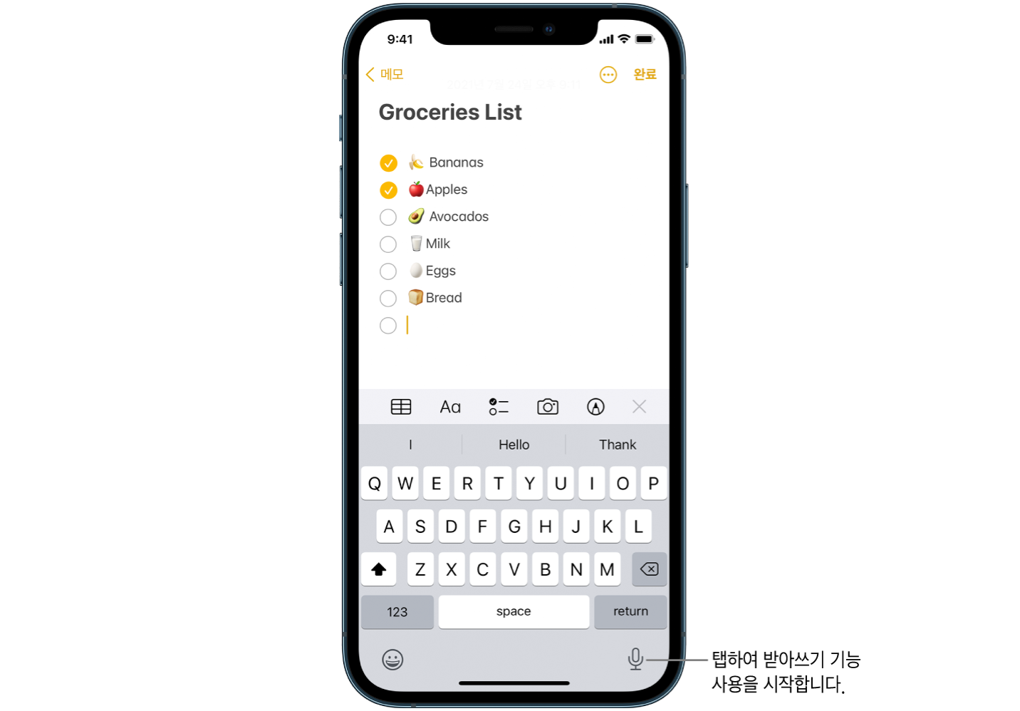설정 > 일반 > 키보드 > 받아쓰기 활성화를 켜서 밑에 이미지와 같이 사용이 가능합니다.
