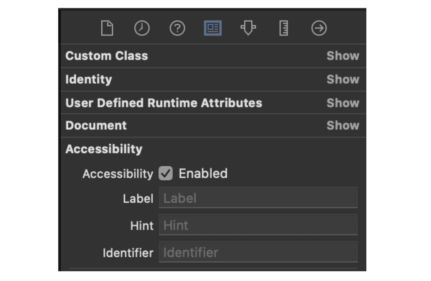 Xcode에서 Accesibility Custom을 다음과 같이 할 수 있습니다. Label : 사용자가 요소를 선택할 때 말할 텍스트 Hint : 선택된 요소에 대한 추가 설명, 요소를 동작시키기 위한 방법 등